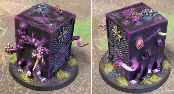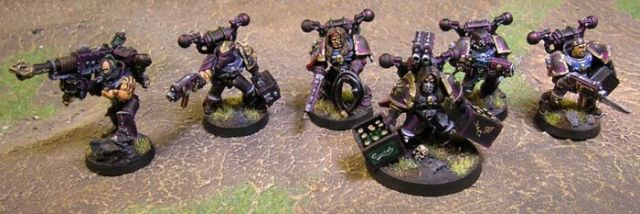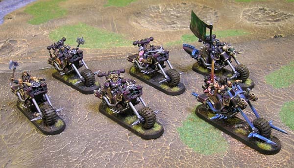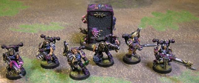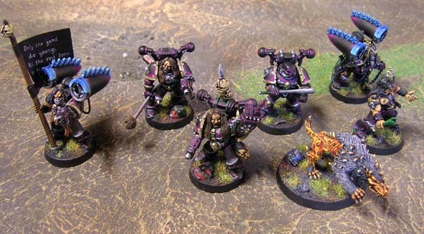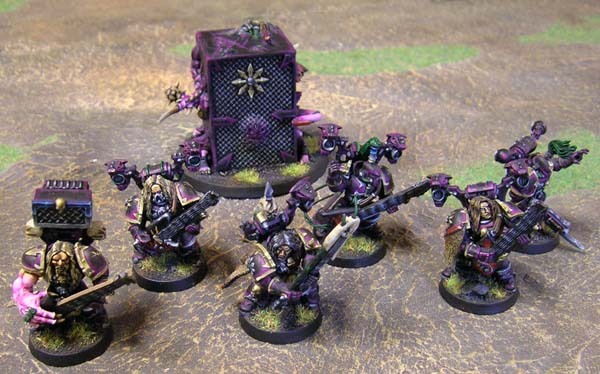 Aquí os traigo otra entrada mas de ejércitos temáticos basados en el Heavy Metal.Si el anterior os gusto,es te es igual de bueno o mas.El otro,mas que un ejercito en si,compacto y plenamente jugable,era una serie de obras de arte dedicadas a grupos famosos.El que os traigo,esta dedicado básicamente a dos,Iron Maiden y Manowar y tiene mas pinta de ejercito jugable 100%.También es de Slaanesh y esta creado por un aficionado sueco,de nick  Bulonicus que lo colgó en Warseer hace ya tiempo.Es un ejercito preparado para jugarse con el codex de MEC de 3ª/ 4ªEd. Aquí una vista en conjunto,tipo foto de familia: