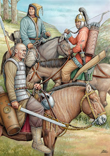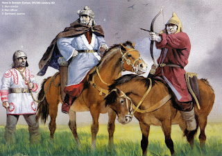 Esto seria mas o menos una partida histórica en toda regla pues los Visigodos y los Hunos chocaron repetidas veces y en época de Atila eran enemigos a muerte.Jugamos dos,por lo que recuerdo,una con la lista D y otra con la A.Perdí las dos,como es normal,pero algo he conseguido ir avanzando.Una de las cosas que me dado cuenta y que también me han dicho es que la lista D esta muy bien,lo que pasa es al ser todo Lh(bueno yo metí el -Gen- también como LH) tengo mucha movilidad y muy poca flexibilidad y si los Hunos ya son de por si un ejercito complicado,eso ya es complicarse el doble.Por eso,aunque jugare algunas con la D,tengo que centrarme mas en la A que es mas variada.Luego lo siguiente bueno es que solo perdí el -Gen- en una y fue porque calcule mal las distancias.Ya no voy tirándolo tan alegremente a los combates!. La otra cosa es que y he aprendido a manejar mejor la velocidad de los Hunos ya que conseguí atacar y saquear el campamento visigodo(y en DBA,saquear el campamento son +2 PV).