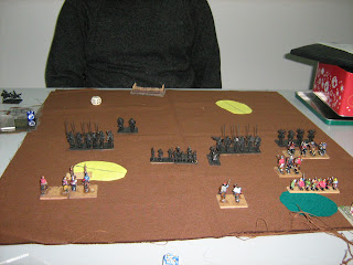 El otro día jugué la siguiente jornada de la Liga de BDA de Madrid contra Carpetano36 en el Generación X que hay en la calle Puebla, que se esta convirtiendo en el lugar habitual para jugar partidas de DBA, al menos para mi. No es mal sitio para jugar, pues se esta relajado y muy muy tranquilo. Carpetano36 saco un ejército de georgianos, que son del libro III de listas de ejército. Si no me falla la memoria, su lista era la III/70 a(ósea, libro III, lista 70 y sublista tipo A),que estaba compuesta por 1x3Kn(Gen),3x3Kn,4x2Lh,3x4Sp,3x2Ps o 3Bw,si no me equivoco. El llevo 2x3Bw y 1x2Ps en su lista de juego. Yo jugué con mis hunos de Atila y esta vez jugué con el Gen que vendría a ser Atila.