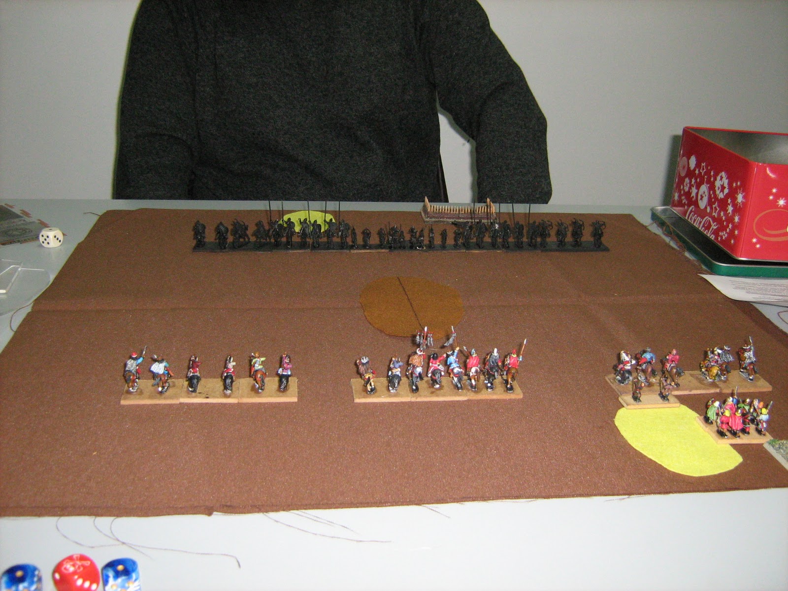 En la primera partida (la de ida) me toco ser el defensor ya que tuve que colocar terreno. Dividí mi caballería en tres grupos, con el Gen en el centro apoyado por mis Kn y una de Lh, mientras ponía dos grupos de LH de 3 bases a cada lado y los Wb y Ps en retaguardia. De esa forma podía cubrir los flancos o darme apoyo con bastante fluidez por pocos PI. La cosa fue pintando bastante bien al principio y conseguí eliminarle dos bases de Lh a mi oponente sin perder ninguna. Eso me hacia la mitad del camino hacia la victoria. Lo malo es que tras esto los dolores de tripa y estomago se me agudizaron y tuvimos que parar un rato para que fuera a “charlar con el Sr. Roca” (Vamos, al WC…).Tras 15-20 minutos o asi en el water, volví, pero los retorcijones me seguían dando la tarde..y de que forma.Eso y una cagada fenomenal (Que irónico, eh? aunque para alguno, con su buen gusto ofendido dirá que es mas bien escatológico…mis disculpas) que hice al arriesgar mucho al Gen, por la impaciencia en parte, hizo que el 0-2 a mi favor acabara en un 3Gen-2 en mí contra, por lo que perdí. Me lío mogollón todavía con las tablas de resoluciones de combates y no se escoger bien los combates, pensando que unos objetivos me convienen y no es asi y viceversa. Asi que el resultado final podríamos decir que es bastante engañoso, visto desde fuera.