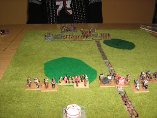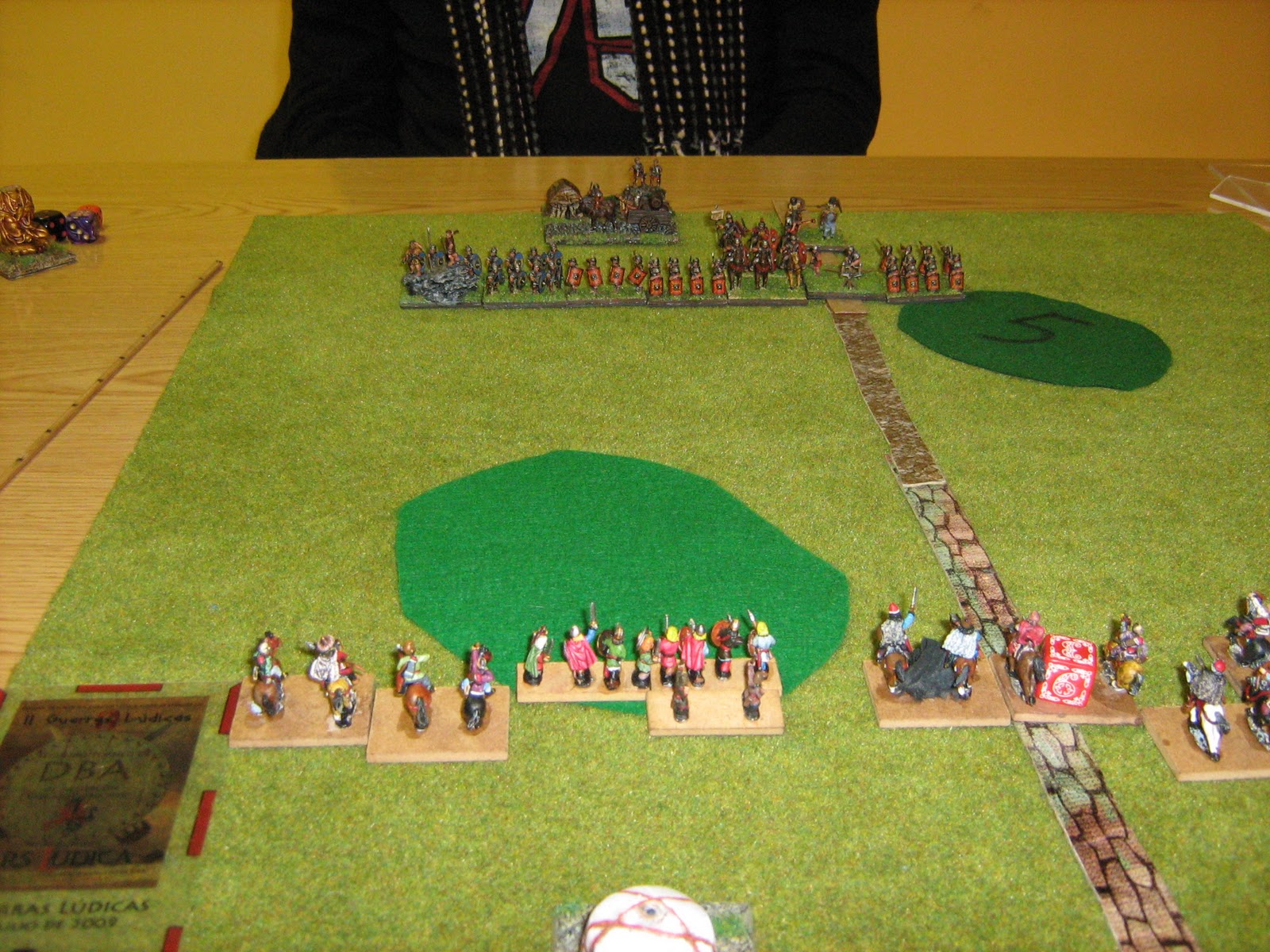En la primera partida,la de ida,yo puse terreno y fui defensor.Tras una hora y pico bien larga,Atila234 gano por un 0-3Gen.La partida tuvo un punto álgido en la dura disputa por una colina suave en el flanco izquierdo de los Hunos,entre dos bases de Lh de los Hunos y dos de Au de los romanos con apoyo de unos Psi.Durante varios turnos el combate estaba muy igualado,con avances y retrocesos por ambas partes,sin poder una quedarse con la colina por encima de la otra.Pero al final,unas tiradas de dados muy malas hicieron que los Lh fueran destruidos y los romanos se quedaran la colina.En el centro,el grueso de los ejércitos chocaron y también hubo una dura pugna,pero en el turno huno,la base que prestaba apoyo por el lado derecho al Gen Huno huyo despavorida de los romanos que la atacaban,dejando vía libre para que en el turno romano fuera el Gen Huno flanqueado y destruido al cerrarle la puerta.