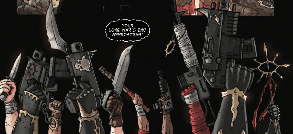 El cómic es obra de Kieron Gillen (Guión) y de Jacen Burrows (Ilustraciones), dos artistas conocidos del mundo delos cómics y que ademas son muy fans de W40K. Las portadas son de, entre otros, James Stokoe, el propio Jacen Burrows y de Clayton Crain. El cómic esta a color y solo ha salido en inglés hasta donde yo se.
